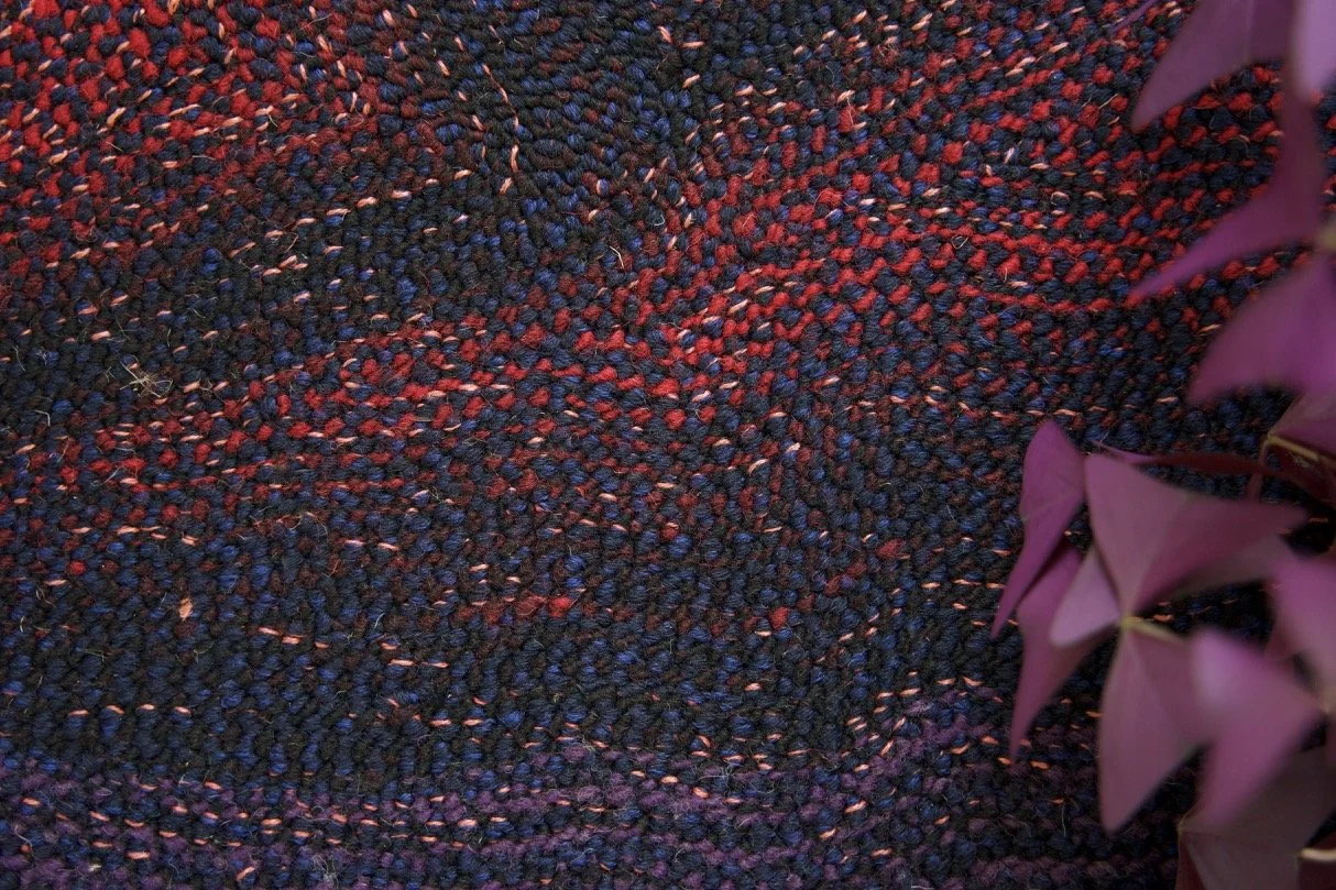 Entre variations colorées et mouvement organique, ce tapis rond de 110cm de diamètre se prête à une installation au mur ou au sol. Une pièce profonde et hypnotique.