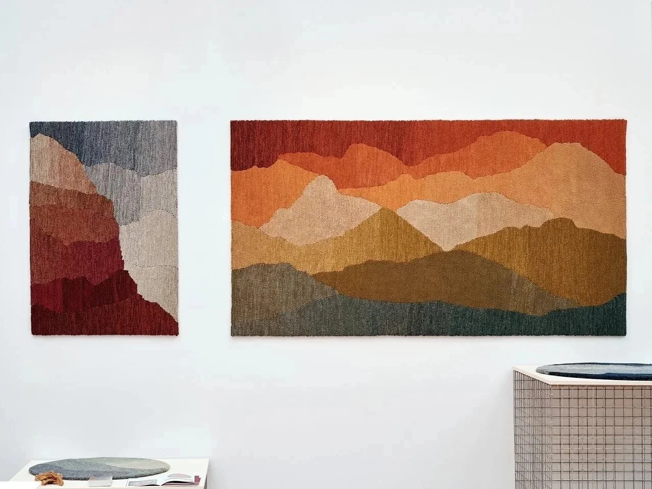 Construit à partir d’un seul très long dégradé, ce grand tapis évoque un paysage et peut se lire dans plusieurs sens, autant au mur qu’au sol.
